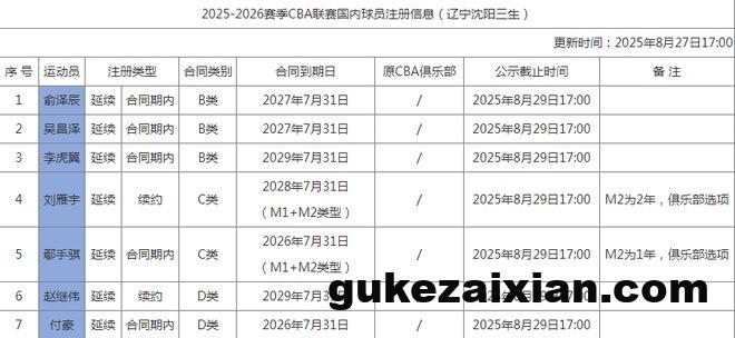 北京时间8月27日,CBA官网公布辽宁男篮注册7位国内球员,其中赵继伟续约4年顶薪合同,付豪顶薪还剩下一年,刘雁宇续约3年C类合同,且刘雁宇被传将租借去吉林男篮,张镇麟未注册被传交易去上海男篮。