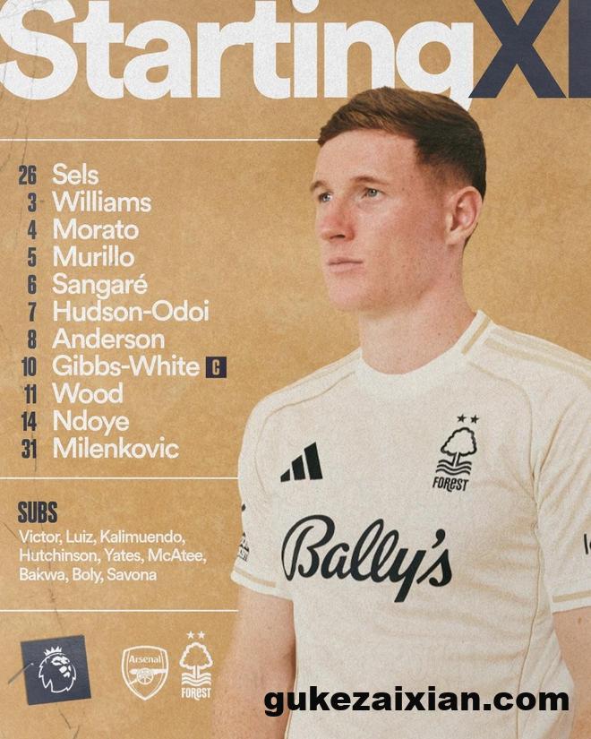 诺丁汉森林首发:26-泽尔斯、4-莫拉托、5-穆里略、31-米伦科维奇、3-内科-威廉斯、6-桑加雷、8-埃利奥特-安德森、10-吉布斯-怀特、7-奥多伊、11-克里斯-伍德、14-恩多耶