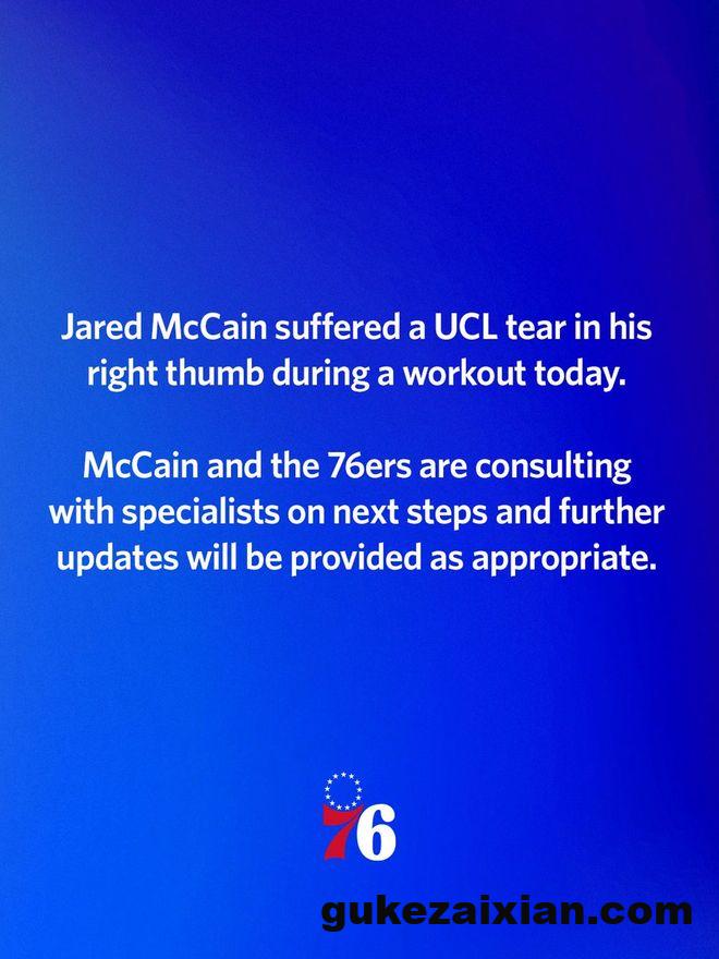 北京时间9月26日,76人官方宣布,麦凯恩在今日的训练中,右手拇指的尺侧副韧带(UCL)出现撕裂。目前,麦凯恩与76人队正就后续处理方案咨询医学专家,相关后续进展将在适当时机进一步公布。