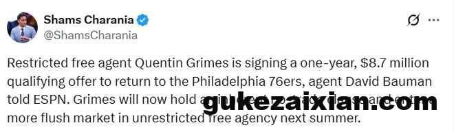 北京时间10月2日,据名记Shams报道,费城76人队受限制自由球员昆汀-格雷姆斯已决定接受一份为期一年、价值874万美元的资质报价。