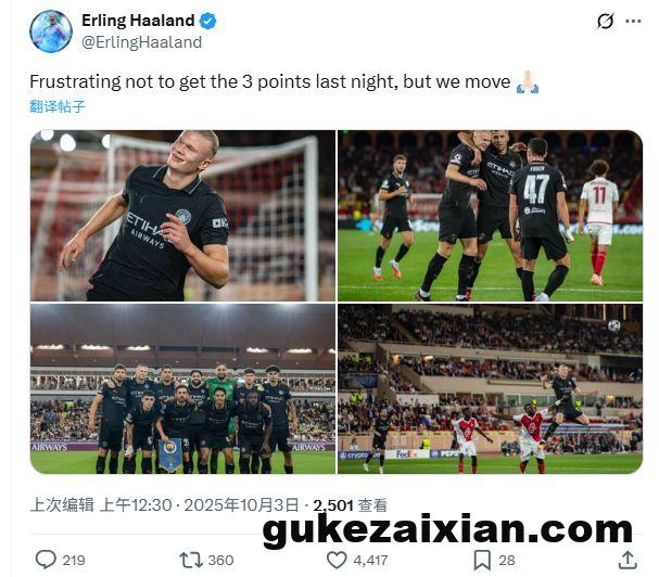 雷速体育10月3日讯 曼城在第二轮欧冠比赛中2-2战平摩纳哥,被对手90分钟点射绝平。哈兰德完成梅开二度难救主。 哈兰德更新社交媒体写道:“昨晚没能拿到三分很沮丧,但我们会继续前进。” 下轮英超比赛,曼城将在两天后客场对阵布伦特福德。 九游会新闻中心 九游·会(j9.com)集团官网-游戏第一品牌新闻中心 恩里克用节奏搞定比赛!巴黎逆转击溃巴萨,弗里克下半场彻底失算 巴黎对阵巴萨阵容平均年龄23岁99天,历史卫冕冠军第二年轻