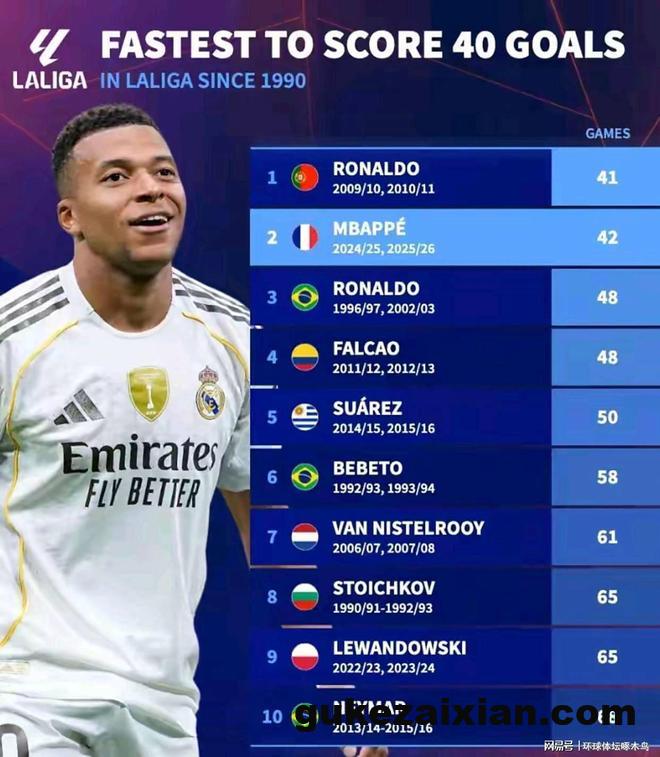 10月8日,当足球世界的目光仍聚焦于姆巴佩在皇家马德里的融入与表现时,一份来自德国转会市场(德转)的权威统计,为这位法国巨星的首个西甲赛季写下了浓墨重彩的一笔。数据显示,姆巴佩仅用42场比赛便攻入40粒西甲进球,这一效率高居自1990年以来西甲历史第二位,仅次于传奇前锋C罗的41场,甚至超越了“外星人”罗纳尔多。这不仅仅是一个冰冷的数字,它宣告着一位新的王者正在伯纳乌的星空下冉冉升起。