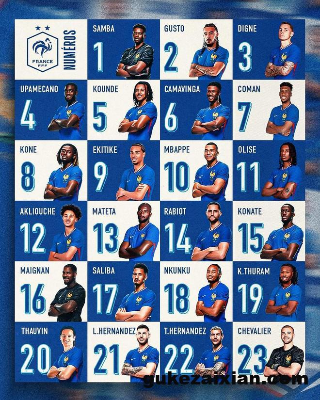 前锋:12-阿克利乌什(摩纳哥)、7-金斯利-科曼(利雅得胜利)、9-埃基蒂克(利物浦)、13-马特塔(水晶宫)、10-姆巴佩(皇家马德里)、18-恩昆库(米兰)、20-托万(朗斯)