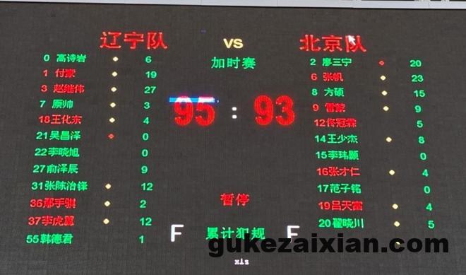中场休息回来,张帆继续发力连得5分,方硕和廖三宁也连续打出反击,北京队将分差缩小到只剩下1分。不过接下来北京队再次陷入得分荒,赵继伟里突外投,李虎翼三分球弹无虚发,高诗岩和付豪也都有得分进账,辽宁队打出一波16-4的小高潮将优势扩大到两位数,并以70-60结束了第三节比赛。末节比赛决战,北京队持续追分,张帆和雷蒙的三分球帮助球队将分差追到个位数。最后阶段比赛打得比较乱,北京队连续打出攻防转换将比分追至86-86平,高诗岩绝杀球不中,比赛进入加时。加时赛阶段,两队依旧打得难解难分,张陈治锋和李虎翼都有得分进账,帮助球队取得领先。最后时刻张帆绝杀三分球不中,辽宁队最终以95-93惊险战胜了北京队。