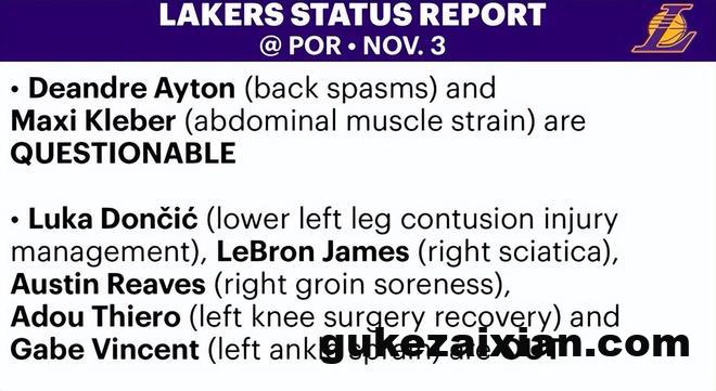 在最新的伤病报告上,湖人5位球员被列为缺阵的状态,2人被列为出战成疑——