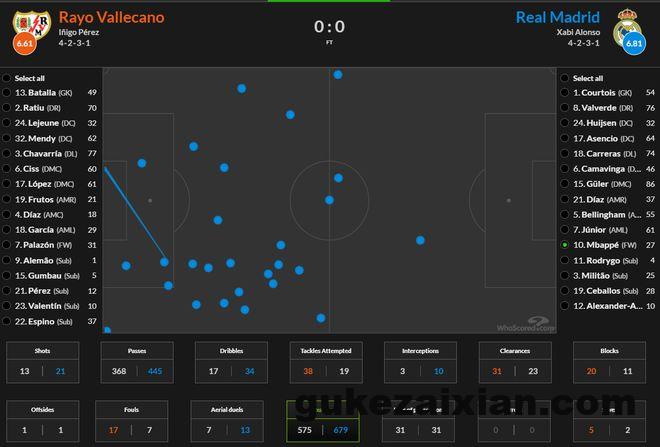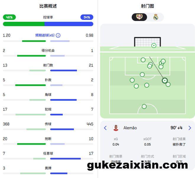 从统计数据可以看到,巴列卡诺的预期进球是1.2比0.98领先皇马,绝佳得分机会也比皇马多1次。