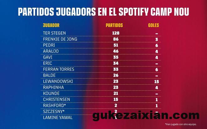 巴萨将在本周末重返诺坎普,坐镇主场迎战毕尔巴鄂竞技,在此之前,巴萨官方统计了队内现役球员在诺坎普的出场次数,特尔施特根以128次居首,弗朗基-德容以86次排名第二。