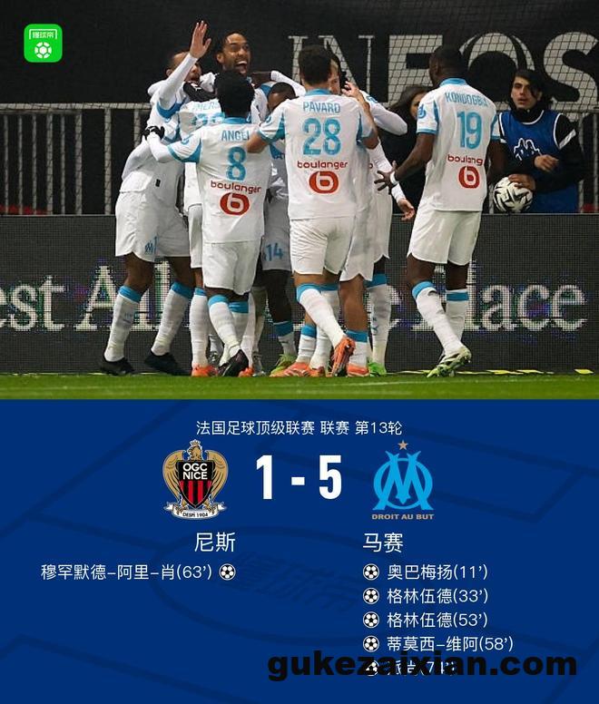 北京时间11月22日法国足球顶级联赛 联赛 第13轮,尼斯主场对阵马赛。尼斯穆罕默德-阿里-肖破门。马赛奥巴梅扬破门,格林伍德梅开二度,蒂莫西-维阿破门,派尚破门。最终比分尼斯 1–5 马赛。