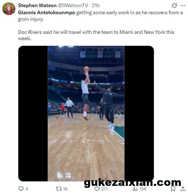 根据道格-里夫斯的说法,扬尼斯在腹股沟受伤的初期就已经开始恢复日常训练,接下来雄鹿的客场之旅(热火、尼克斯)字母哥也会随队,根据Shams的报道扬尼斯是腹股沟一级拉伤,恢复时间是1-2周。