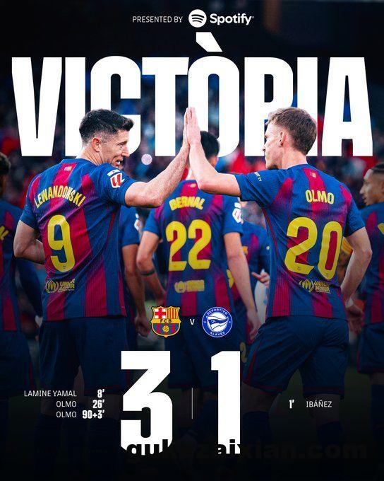 北京时间11月29日23:15,西甲联赛第14轮,巴萨坐镇主场迎战阿拉维斯。上半场伊巴涅斯开场闪击反客为主,亚马尔抽射扳平比分,加西亚献神扑,拉菲尼亚助攻奥尔莫反超比分,亚马尔中柱,半场结束,巴萨2-1阿拉维斯。下半场亚马尔助攻奥尔莫推射破门,最终巴萨3-1逆转阿拉维斯先赛2分领跑。