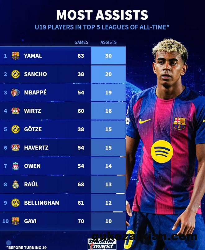 北京时间12月2日,德转统计出了欧洲五大联赛历史U19球员的助攻榜,亚马尔以83场比赛助攻30次高居第一,桑乔和姆巴佩位列第二和第三位。