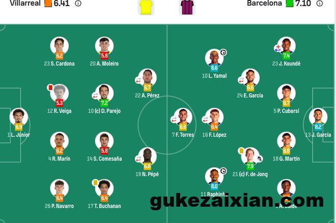 比利亚雷亚尔首发:1-路易斯·儒尼奥尔、4-马林、12-维加、23-卡尔多纳、26-纳瓦罗、10-帕雷霍(75’37-马西亚)、14-康萨尼亚、17-布坎南、19-佩佩(75’21-奥卢瓦塞伊)、20-莫莱罗、22-阿约泽·佩雷斯(66’9-米卡乌塔泽)。