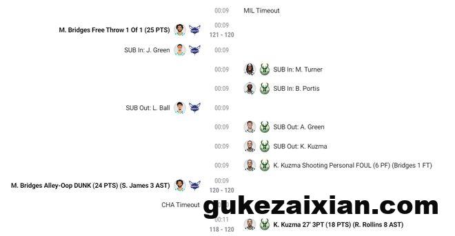 库兹马命中这个120-108的三分球后雄鹿全队开始庆祝,球迷们都站起来庆祝。可很快就笑不出来,因为布里奇斯面对库兹马完成了空接2+1,黄蜂121-120再度反超黄蜂。