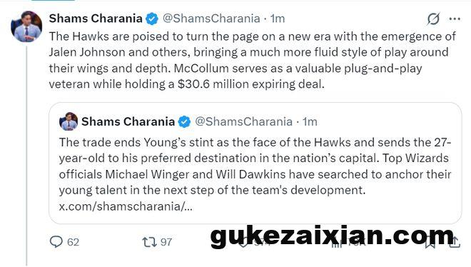 北京时间1月8日,根据ESPN记者Shams的报道,奇才与老鹰达成交易,老鹰将特雷杨送到奇才换取麦科勒姆、基斯珀特,这笔交易只是1换2,换言之特雷杨的交易价值是负面的。