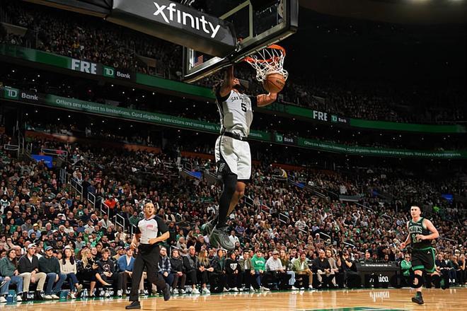 本场比赛中,虽然马刺取得了比赛的胜利,但是球队的先发后场新星斯蒂芬-卡斯尔(Stephon Castle)的表现算得上是令人大跌眼镜。卡斯尔全场出场26分36秒,投篮16中3,三分线外7中1,罚球5中2,得到了9分2篮板5助攻2抢断的数据,还有2次失误,正负值也是低到了全队最低的-7。卡斯尔在进攻端其实得到了大量的出场时间和出手机会,然而他的进攻效率一塌糊涂,外线投篮手感糟糕透顶,而且他在进攻选择方面也是存在着明显的问题的,显得有些上头了,浪费了大量的机会。卡斯尔在防守端的表现还算中规中矩,但是这也没有办法改变他在进攻端给球队造成的巨大负面影响。最后时刻卡斯尔没有出现在球场上,这反而是马刺能够稳住局面并且拿下胜利的关键因素。