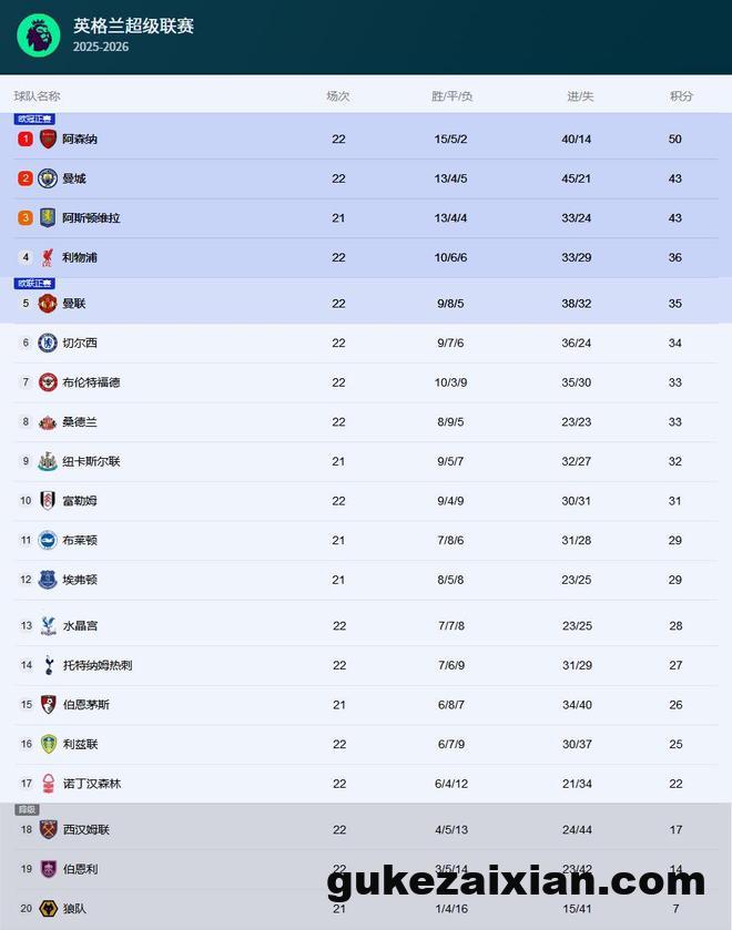 英超第22轮继续进行,多支球队完成了自己的第22轮比赛。英超积分榜排名前两位的阿森纳和曼城分别取得一平一负的战绩。其中,阿森纳客场0-0战平诺丁汉森林,曼市德比曼联2-0复仇曼城,最终,阿森纳以7分优势领跑英超积分榜。