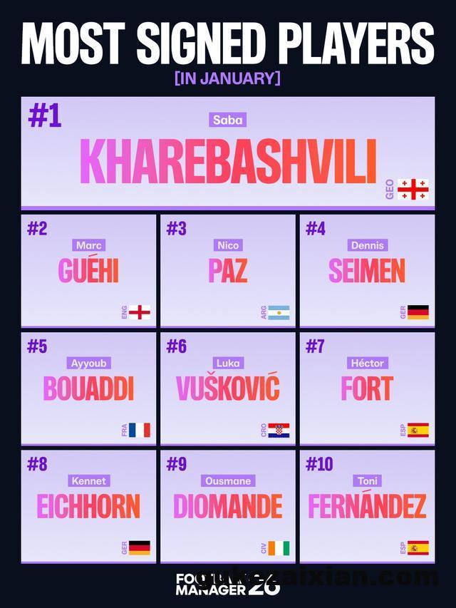 马克-格伊、尼科-帕斯、迪奥曼德、阿尤布-布阿迪……看到这些名字还算正常。然而,在热门游戏《足球经理》1月份全球最常被签下的十名球员中,有一个排名第一的名字格外引人注目,因为几乎无人知晓他是谁——:萨巴-哈列巴什维利(第比利斯,2008年9月3日出生)。