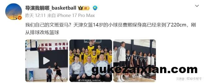 然而,近日,根据知情人士透露,中国女篮又冒出一个2米20的天才大个子了。据悉,这名天才中锋来自于天津女篮,名字为曹熙琛,今年只有14岁,但身高已经长到了2米20。而且,根据该知情人士透露,曹熙琛原先并不是练篮球的,在进入到篮球项目之前,她是学习排球的。只不过,由于后来身高长得非常快,最终不得不放弃排球,转而练起了篮球。