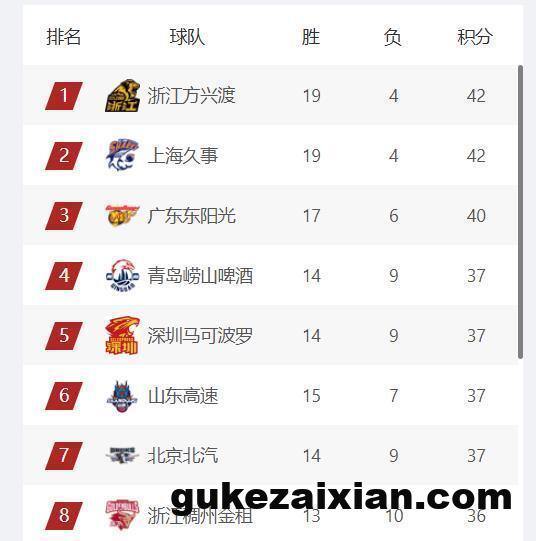 CBA常规赛第一阶段的比赛结束,目前浙江广厦队和上海队的战绩都是19胜4负,位列常规赛排名榜的前2,广东队以17胜6负的战绩排名第3;青岛队的战绩14胜9负排名第4,深圳队同样14胜9负排名第5,山东高速男篮15胜7负排名第6,北京首钢队14胜9负排名第7,浙江稠州队13胜10负排名第8。