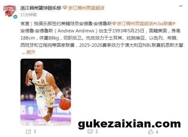 除此之外,浙江男篮官宣顶替约克的新外援安德鲁-安德鲁斯加盟:美国外援安德鲁-安德鲁斯出生于1993年5月25日,身高188cm,体重88kg,司职后卫。安德鲁斯先后效力于土耳其、拉脱维亚、以色列、希腊、西班牙和立陶宛等国家联赛,2025-2026赛季效力于澳大利亚NBL联赛凯恩斯太攀蛇俱乐部。
