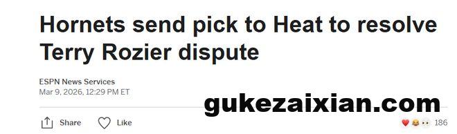 北京时间3月10日,据ESPN报道,夏洛特黄蜂队将把一枚2026年次轮选秀权送至迈阿密热火队,以解决双方在2024年交易特里-罗齐尔时产生的纠纷——罗齐尔当时正因涉嫌赌球阴谋,正接受NBA与联邦调查。这枚次轮签将是勇士队或掘金队2026年次轮签中顺位更优的一个。