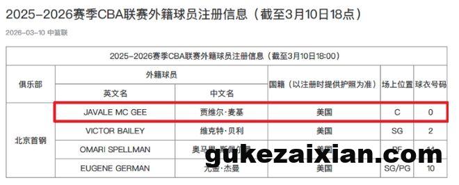 北京时间3月10日,CBA官方公布最新外援注册情况,北京男篮已经为前NBA3冠中锋麦基完成注册,他将身穿0号球衣征战CBA第二阶段的比赛,有望在3月11日对阵四川男篮的比赛迎来加盟首秀。