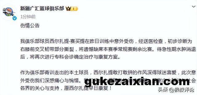 北京时间3月10日,根据新疆男篮官方社媒公示,我俱乐部球员西尔扎提·赛买提在昨日训练中意外受伤,经送医检查,初步诊断为右膝前交叉韧带部分撕裂,将遗憾缺席本赛季常规赛剩余比赛。