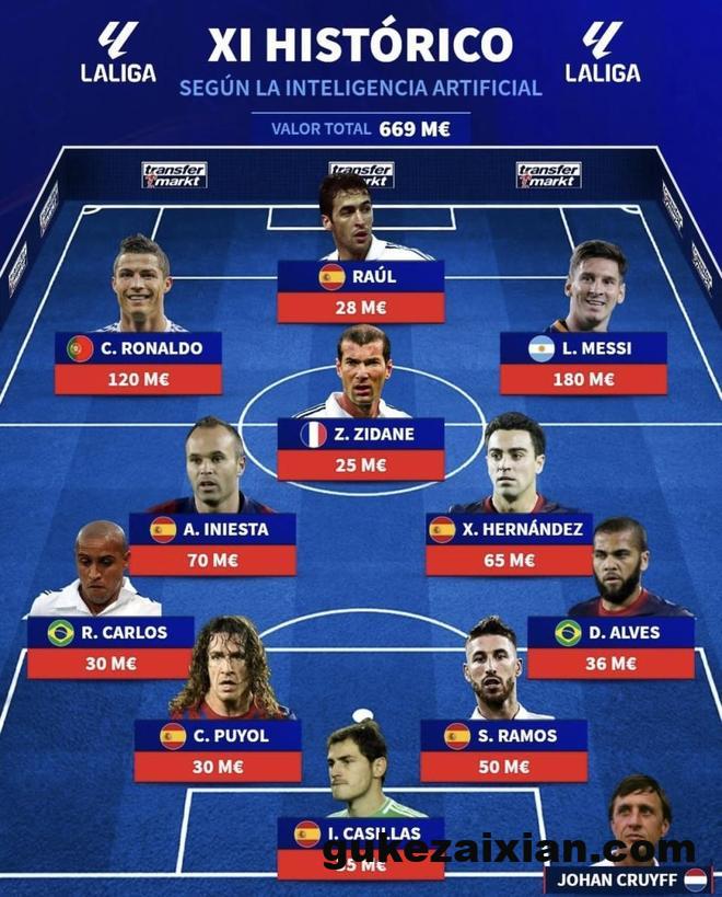 最近德国转会市场西班牙站整理了“西甲历史最佳阵容”。名单把前场的C罗、劳尔、梅西直接摆在一起,中场则是齐达内、哈维、伊涅斯塔这种控球与创造力拉满的组合。与此同时,迪斯蒂法诺、普斯卡什、罗纳尔迪尼奥并不在名单里。可仔细看阵容名单,两名边后卫都以压上见长,而中场三人偏组织与控球,这套阵容真要踢强强对话,进攻会有多夸张,防守会不会被反击一打就穿?(数据截至2026年2月24日)