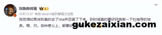 对于徐昕收到NBA球队试训的消息,媒体人“别跑刚背猪”表示,如果徐昕真的能够留在NBA的话,“到时候真的要好好感谢一下杜指导的培养。嗯,对。各种意义上,都要好好感谢一下!”至于这位媒体人要表达什么意思,球迷们需要好好体会。