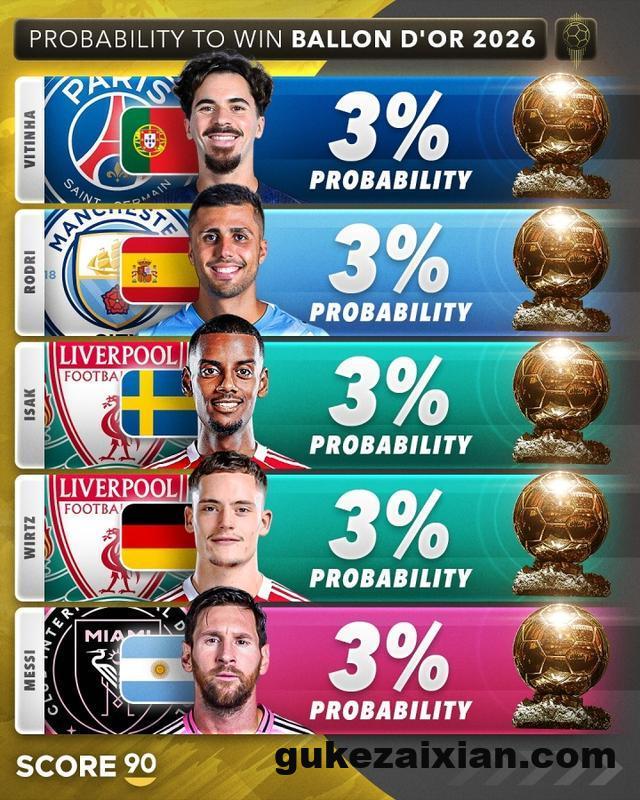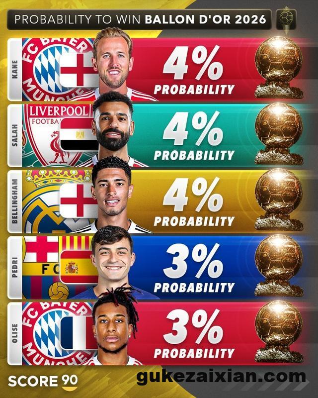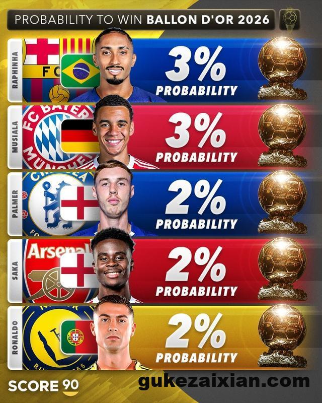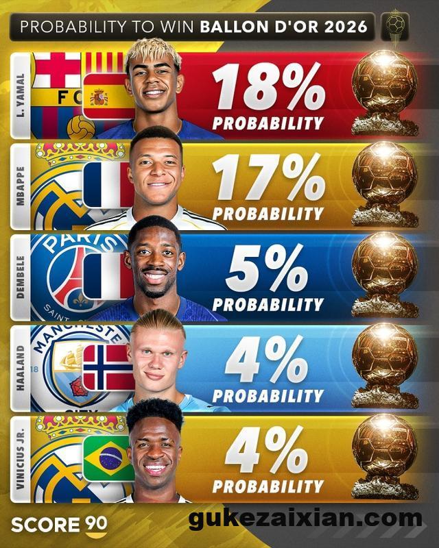直播吧09月26日讯 外国媒体SCORE90根据相关机构赔率,列出了2026年金球奖获奖概率,其中巴萨前锋亚马尔以18%的概率领跑。