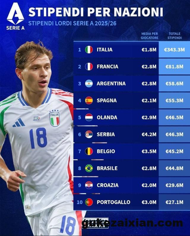 1、意大利:平均年薪180万欧元;总薪资3.433亿欧元