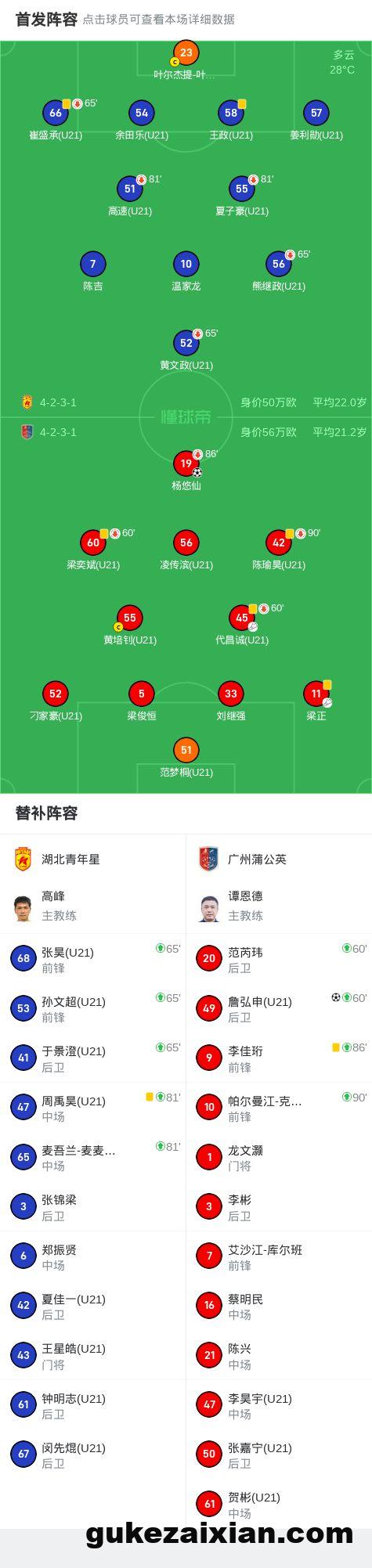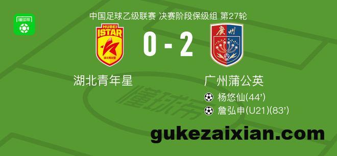 北京时间9月28日,中国足球乙级联赛决赛阶段保级组第27轮展开较量,湖北青年星坐镇主场迎战广州蒲公英。比赛中,广州蒲公英率先打破僵局,代昌诚送出精准助攻,杨悠仙冷静施射得手,为球队取得领先。易边再战,广州蒲公英扩大优势,梁正送出关键传球,詹弘申把握机会再下一城。最终,广州蒲公英以2比0客场战胜湖北青年星,全取三分。