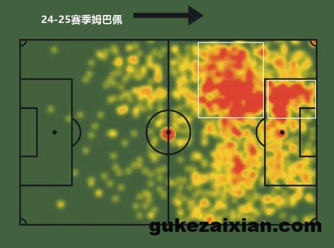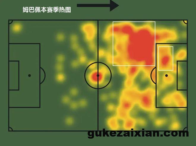 从上赛季的热图可以看到,当时在安切洛蒂的要求下,姆巴佩还稍稍有点9号的样子,至少会频繁杀入禁区肋部发起攻击。
