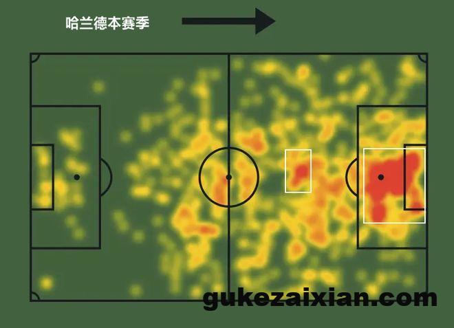 从热图区可以看得很清楚,哈兰德就是在对方禁区中路频繁接球,然后把球送入网底。为此哈兰德过去这些年,很大程度提升了自己的头球技术,减少自己的短板。