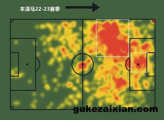 而且哪怕是22-23赛季,已经36岁的本泽马,他的热图区已经是禁区内有一大块中路高亮。一个豪门9号如果不能在中路产生影响力,那对于本队的伤害将会是巨大的。