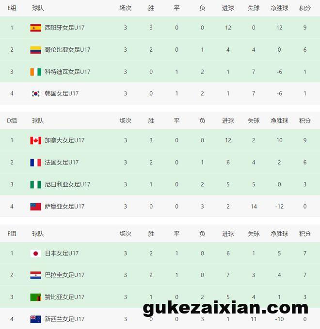北京时间10月26日凌晨,新一届U17女足世界杯小组赛最后一个比赛日,D组、F组结束的所有比赛,法国1-2输给加拿大、尼日利亚4-0大胜萨摩亚、日本1-1绝平巴拉圭、新西兰0-4惨败赞比亚。至此,各组的最终积分榜和晋级淘汰赛的球队全部出炉。