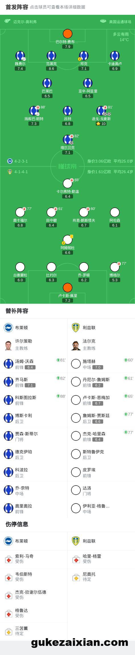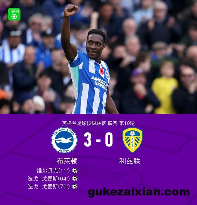 第64分钟,迭戈-戈麦斯包抄破门,布莱顿2-0领先利兹联