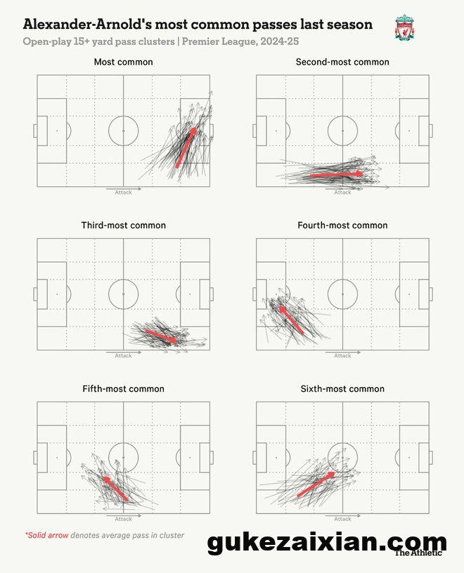 下图突显了阿诺德上赛季最频繁的长传(超过15码),展示了那些快速传中对禁区内的威胁。