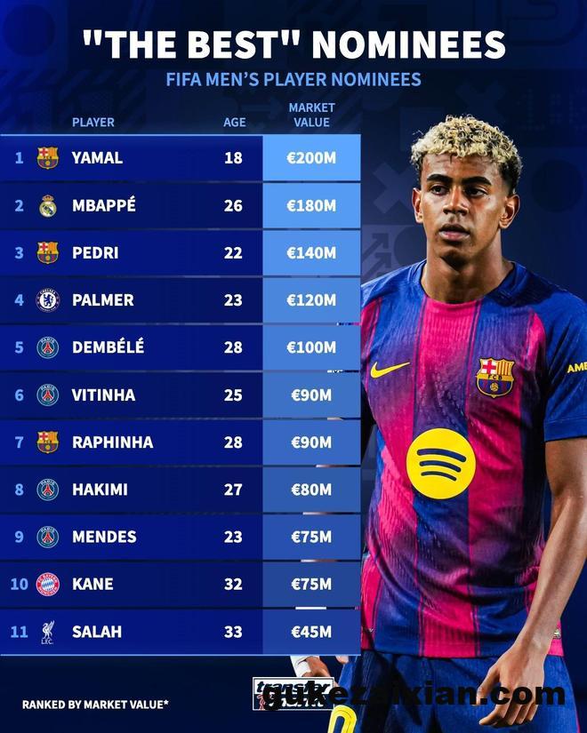 北京时间11月7日凌晨,国际足联官方公布了年度最佳球员候选名单,其中,亚马尔、登贝莱、姆巴佩等多人在列。