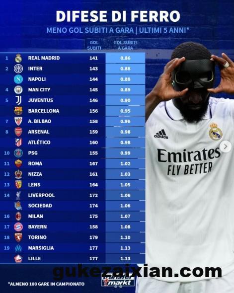 当地时间11月14日,德国转会市场在社交媒体上发布了近5年五大联赛各家俱乐部的场均失球榜,并列出场均失球最少榜单(至少参加100场联赛)。