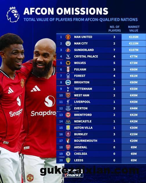 北京时间11月21日,德转列出英超20家俱乐部本届非洲杯晋级国家球员的总身价,曼联3人1.35亿欧元第一,曼城2人1.15亿欧元第二,桑德兰7人1.07亿欧元第三。