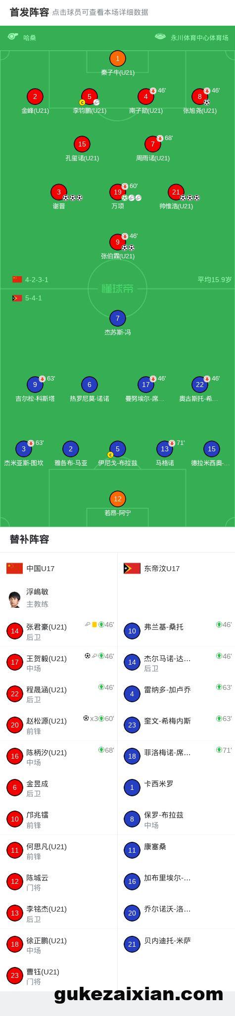 北京时间11月24日U17亚洲杯 预选赛 第2轮,中国U17对阵东帝汶U17。本场比赛谢晋、帅惟浩、赵松源上演帽子戏法,张伯霖梅开二度,王贺毅、万项、张旭尧破门。最终国少14-0血洗东帝汶U17。