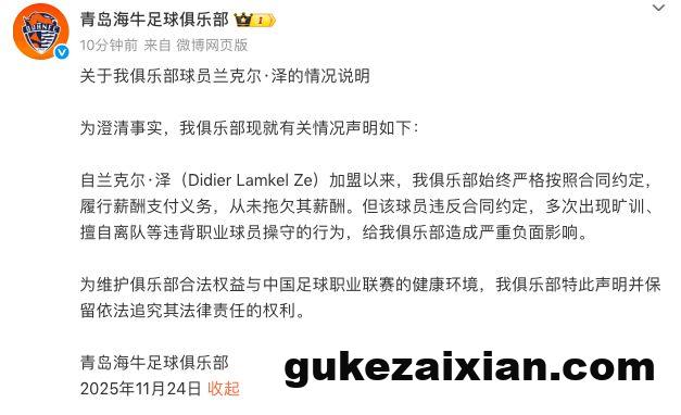 北京时间11月24日晚,中超青岛海牛俱乐部官方发文,回应了关于外援兰克尔-泽的欠薪指控。