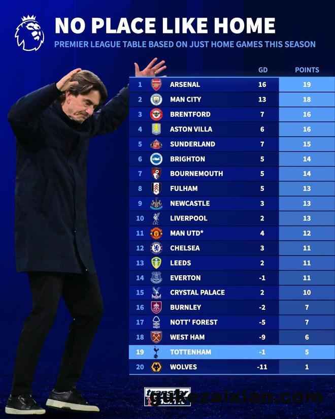 足球数据网站德转盘点了本赛季英超主场战绩榜,其中,领头羊阿森纳积19分居首,曼城18分紧随其后,曼联少赛一场拿了12分,热刺仅积5分位列倒数第二。