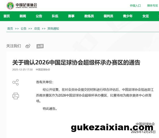 12月25日下午,中国足协官网发布消息,2026中国足协超级杯将在南京奥体中心体育场进行。