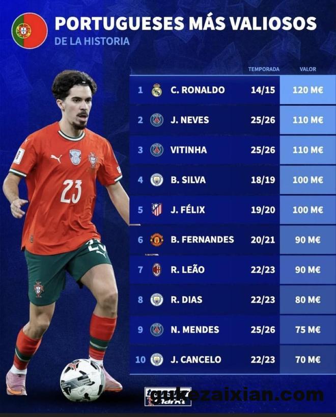 最近德国转会市场整理了“历史身价最高的葡萄牙球员”这份榜单,C罗和菲利克斯这些名字都在里面。最有意思的点不在“谁上过巅峰”,而在同一份表里把“当时身价最高值”和“现在身价”并排放出来之后,落差一下就出来了:有人从顶点回撤得很狠,也有人几乎没怎么掉。把这两列数字对照着看,谁的高位更稳、谁的峰值更像一阵冲高,这张表本身就把矛盾摆在台面上了。