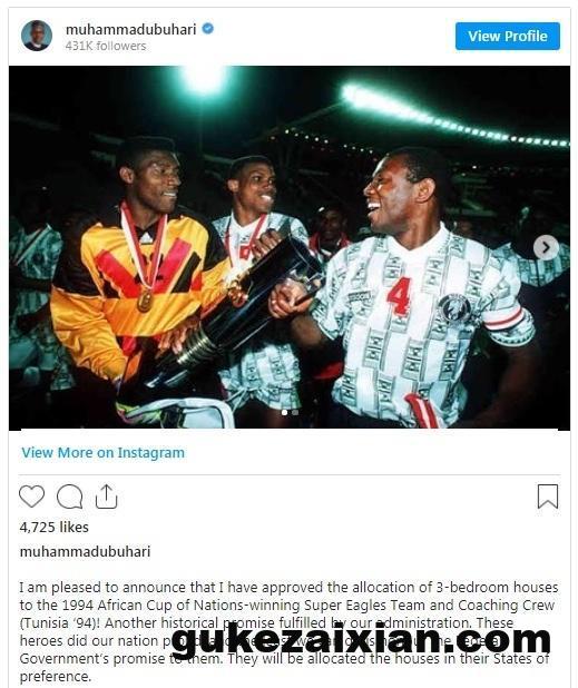 2021年6月,尼日利亚总统布哈里批准向当年那支夺冠的球队成员分配一套三居室房屋,共有22名人员获得这一奖励,可惜包括时任尼日利亚队长兼教练斯蒂芬-克什在内的5人已经去世。