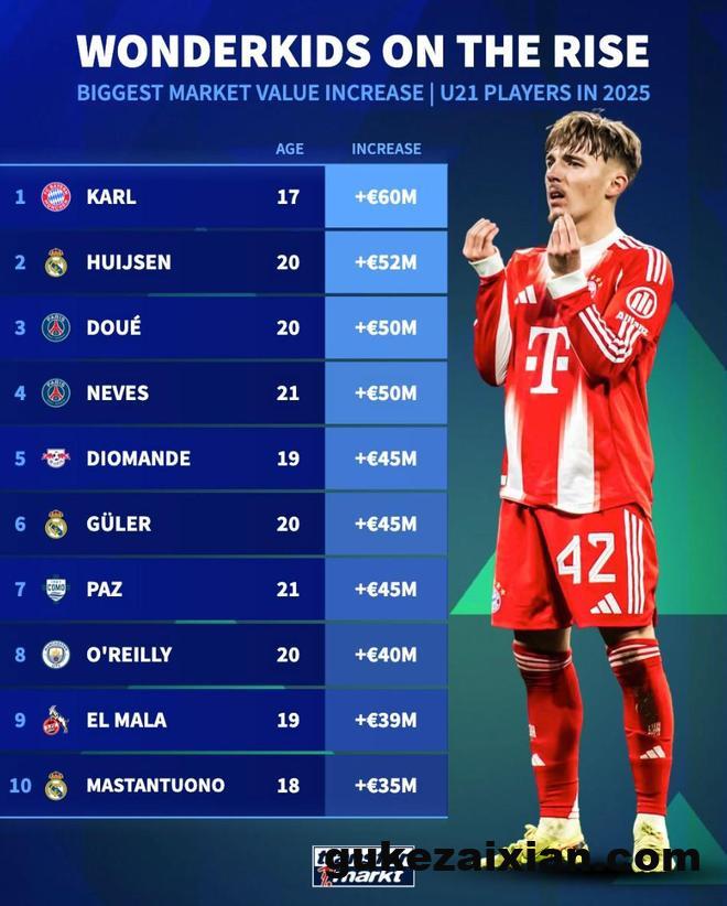 德转列2025年身价涨幅最高的U21球员TOP10: