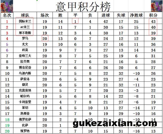 积分榜方面,随着那不勒斯绝平国米,上轮前3的争冠三强本轮都没能赢球,国米就还是3分优势力压AC米兰领跑。那不勒斯最后时刻拿到1分后,少赛一场,以净胜球优势超过罗马重回前3。