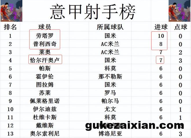 射手榜方面,劳塔罗今天未能进球,还是10球领跑,普利西奇8球位列第2。恰尔汗奥卢点射建功,追上莱奥,两人7球并列第3。佩莱格里诺则是追上苏莱,图拉姆和霍伊伦等人6球刚好挤入前十。